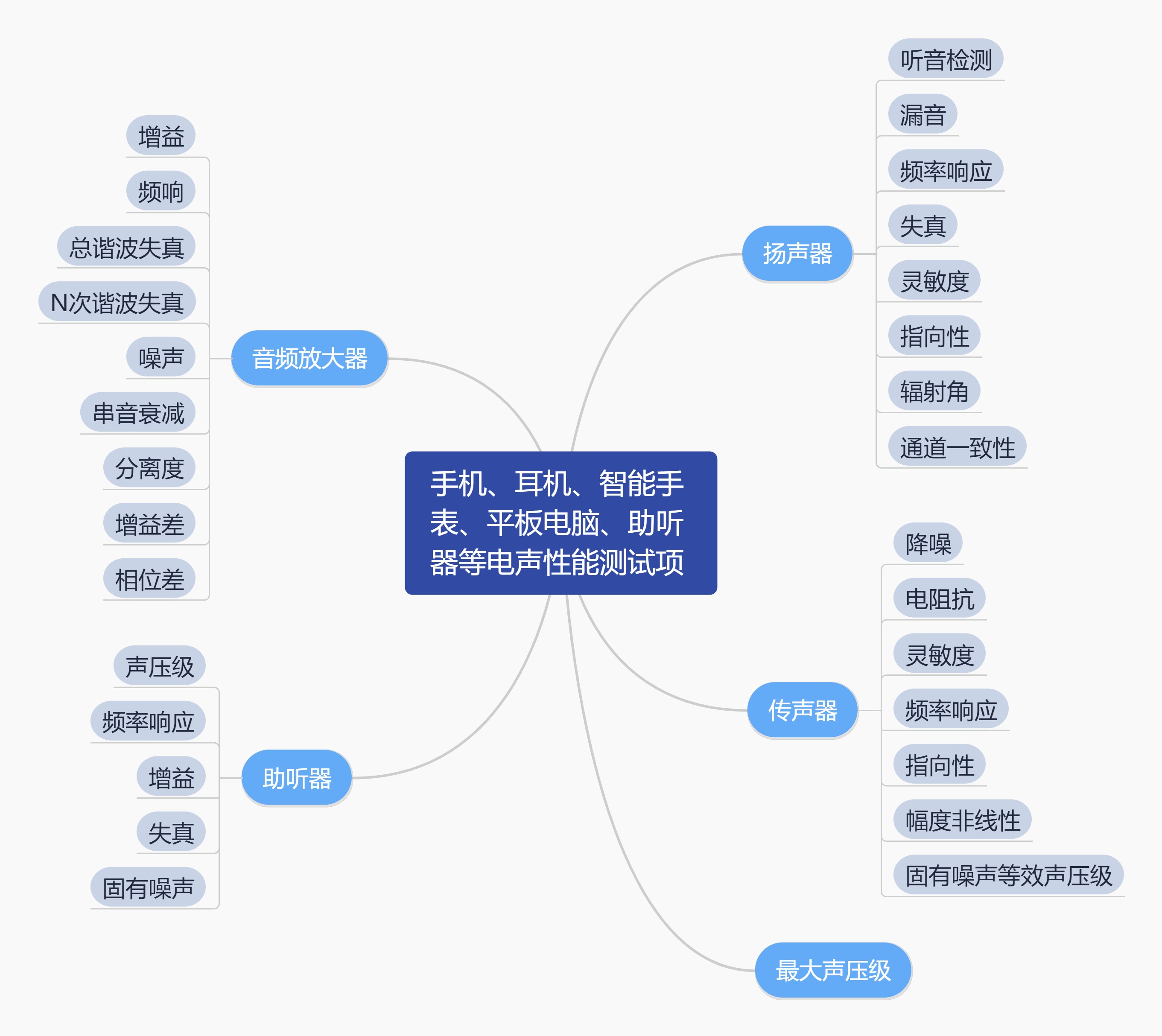 电声性能主要包含敏感元件在声转电、电转声、声信号传输、电信号传输过程中引起的信号变化,主要包含:发声器件、收音器件、信号放大器件等三个关键部分。发声器件主要考量对输入电信号的转换效率、还原程度以及用户的听音体验,涉及到的参数有:听音检验,侧音,漏音、输入阻抗、频率响应、失真、灵敏度、指向性、辐射角等。收音器件主要考量对输入声信号的转换率、噪声抑制能力、有用信号的提取能力,涉及的参数有:电阻抗、灵敏度、频率响应、指向性特性、幅度非线性、固有噪声引起的等效声压级等。信号放大器件主要是在不引起非线性失真的前提下对有用信号进行放大,主要涉及电声参数有:增益、响应、总谐波失真、n次谐波失真、噪声、串音衰减和分离度,通道间的增益差和相位差等。除此之外,还有以上三种器件的组合,比如降噪耳机、智能音响、助听器等,需要综合运用测试手段,对产品或元器件性能进行识别。