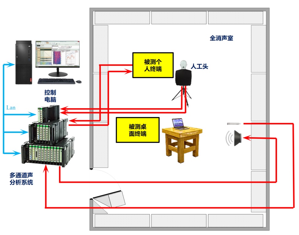 对于可穿戴的电声产品性能测试,通过头和躯干模拟器模拟真人使用情景,其内置的仿真耳和仿真嘴分别模拟真人“听”和“说”的过程,主要采用多通道声分析系统,提供标准音源,输入到被测样品的扬声器,通过仿真耳进行采集,并将得到的信号输回到采集分析系统进行性能分析;与此同时,通过头和躯干模拟器的仿真嘴输出标准声源,经被测样品的传声器采集后,传回声分析系统进行数据处理。整个测试流程旨在通过模拟实际使用场景,最大程度地还原用户的应用实际状况,从而精准测试。